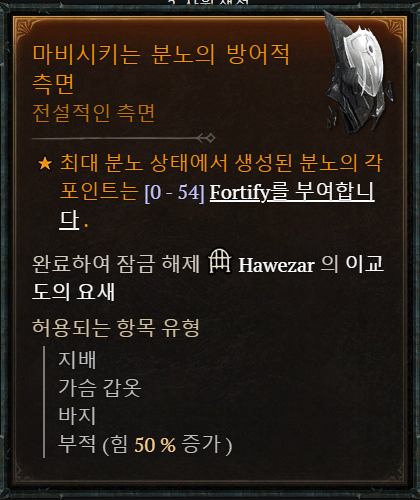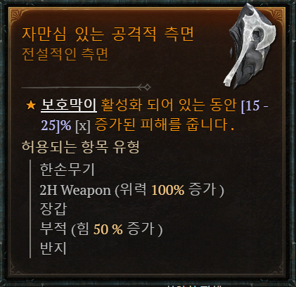 허용되는 아이템 유형: 투구, 가슴 방어구, 장갑, 장화, 방패, 목걸이 [+50%]