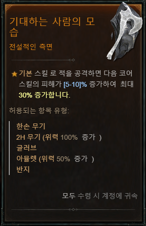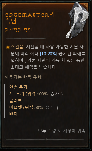 한손 도끼 전문성: 행운의 적중: 극대화 적중 시 최대 55% 확률로 2초 동안 공격 속도가 6% 증가합니다. 2개의 도끼 사용시 효과 2배 증가. 부상당한 적에 대한 극대화 확률이 5.0% 증가합니다. 2개의 도끼사용시 효과 2배 증가.