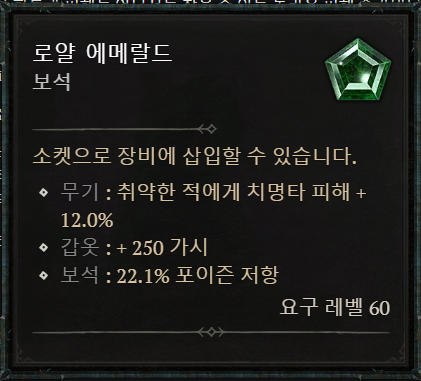 갑옷에는 로열 사파이어를 추천합니다. 악세서리에는 로얄 스컬을 적용하며 "Disobedience 불복의 위상"을 같이 사용합니다. 무기에는 로열 에메랄드를 사용해서 치명타 피해를 챙겨줍니다.
