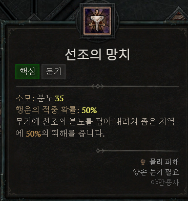 야만용사 무기고 시스템의 양손검 전문성으로 출혈을 일으킵니다. "Aspect of Berserk Ripping 광포한 찢기의 위상"을 적용하여 소용돌이의 "맹렬한 소용돌이"를 사용해서 출혈피해를 높일 수 있습니다. (무력화의 감속도 도움이 됩니다.)